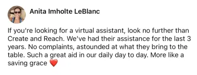 If you’re looking for a virtual assistant, look no further than Create and Reach. We’ve had their assistance for the last 3 years. No complaints, astounded at what they bring to the table. Such a great aid in our daily day to day. More like a saving grace ❤